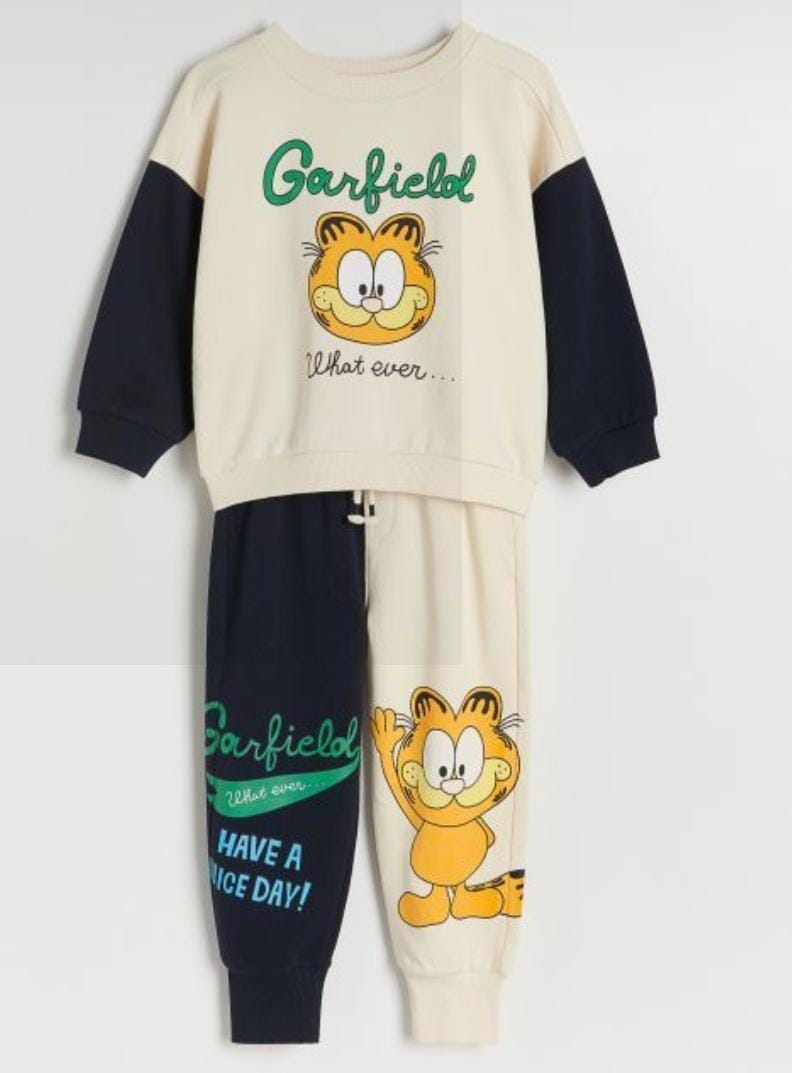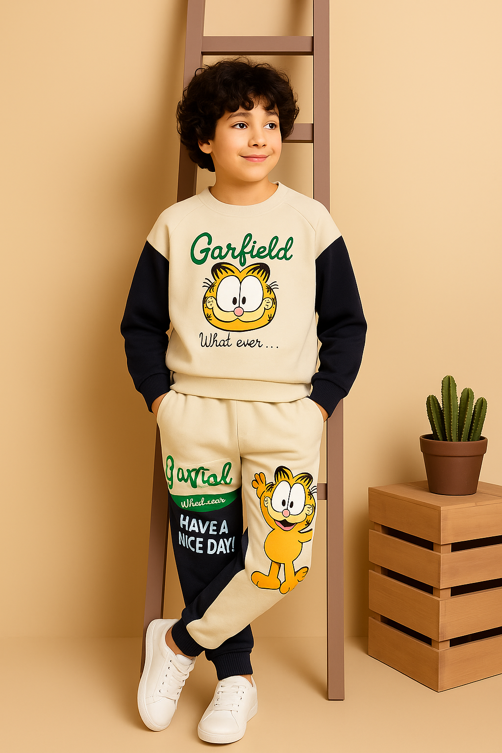 This kids’ fleece set features a cozy cream-and-navy sweatshirt and jogger pair with playful Garfield prints. The top showcases Garfield’s iconic face with the phrase “What ever…”, while the joggers feature bold graphics saying “Have a Nice Day!” and a waving Garfield illustration. Made from soft fleece fabric, it’s warm, comfortable, and perfect for casual everyday wear with a fun, cartoon-inspired vibe.