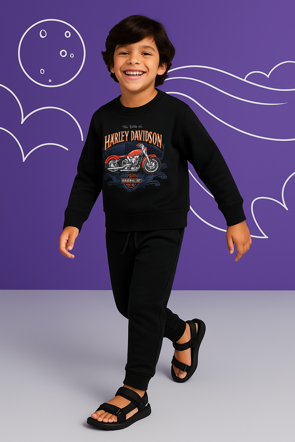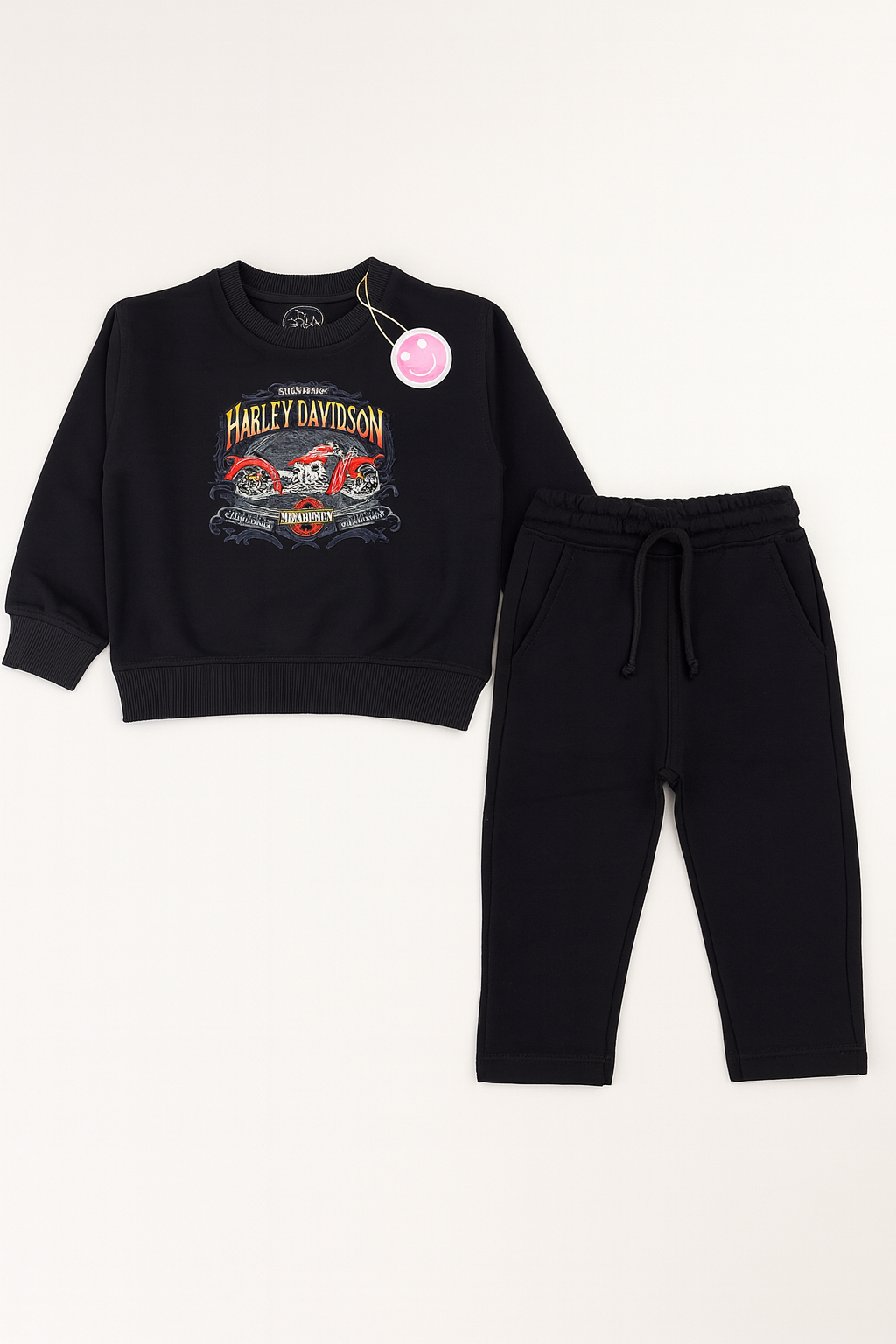 This kids’ terry set includes a black sweatshirt and matching jogger pants for a stylish and comfy look. The sweatshirt features a bold Harley-Davidson motorcycle graphic on the front, giving it a cool and edgy vibe, while the joggers come with an adjustable drawstring waist for comfort. Made from soft terry fabric, it’s perfect for casual wear, offering both warmth and durability.