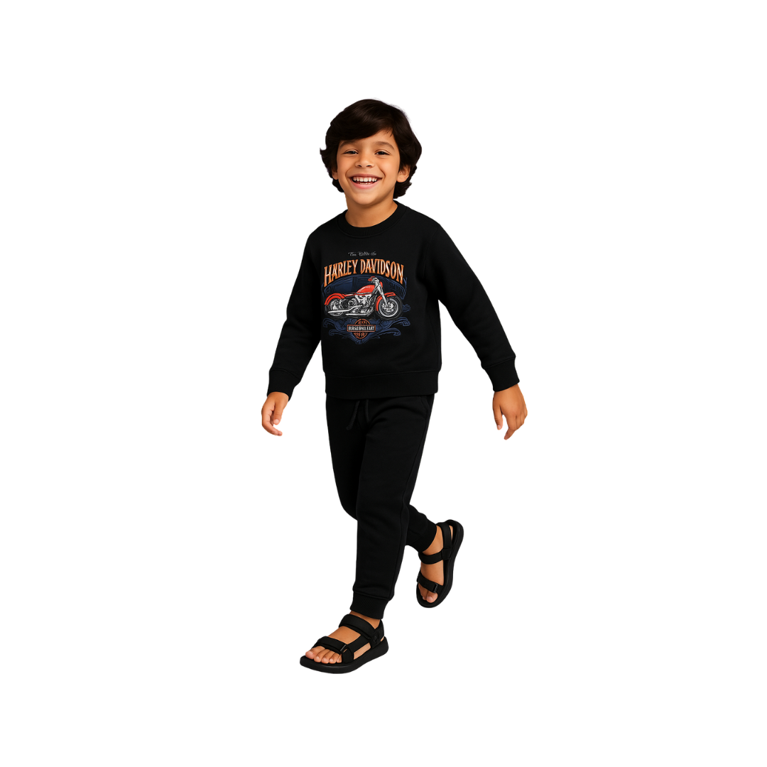 This kids’ terry set includes a black sweatshirt and matching jogger pants for a stylish and comfy look. The sweatshirt features a bold Harley-Davidson motorcycle graphic on the front, giving it a cool and edgy vibe, while the joggers come with an adjustable drawstring waist for comfort. Made from soft terry fabric, it’s perfect for casual wear, offering both warmth and durability.